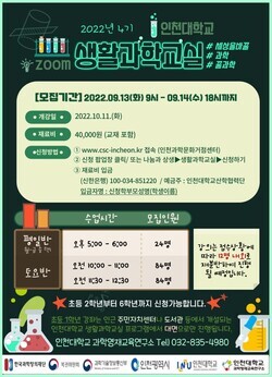 생활과학교실은 월~금요일은 24명씩 1개 반, 토요일은 84명씩 2개 반을 개설하며, 실시간 온라인 줌(ZOOM)으로 이뤄진다. 인천 과학문화거점센터 홈페이지(www.csc-incheon.kr)를 통해 오는 13~14일 접수할 수 있으며, 선착순으로 마감된다.